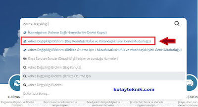 2. Arama bölümüne “Adres Değişikliği” yazın ve “Adres Değişikliği Bildirimi (Boş Konuta)” seçeneğine girin.,