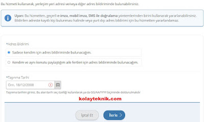 Bu işlem eğer ikametinizi kaydedeceğiniz adreste hali hazırda oturan kimse yok ise yapabilirsiniz. Eğer Taşınacağınız adreste ikamet eden birisi varsa bunun için bir sonraki başlıktaki “Adres Beyanı İçin Muvafakat Verme” işlemini uygulayın.